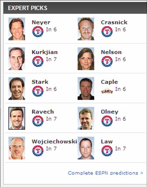In the Worldwide Leader’s annual act of making-so-many-predictions-you’re-probably-going-to-get-at-least-one-right, the panel of so-called experts made their picks for MLB division winners and World Series champions for the 2014 season. The Dodgers and the Nationals were the big winners, snagging eleven and twelve votes to win the World Series, respectively. The Giants…not so much.